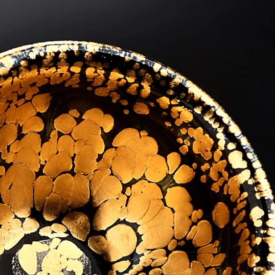 - Material: High-fired iron-rich ceramic (kaolin clay) with 24k gold oil spot glaze