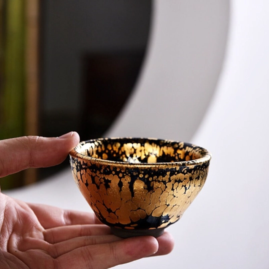 Jian Zhan (literally “Jian Kiln bowl”) is a legendary Chinese tea ware with over 1,000 years of history. Originally created during the Song Dynasty for tea ceremony, Jian Zhan has been prized by tea connoisseurs for its unique crystalline glaze patterns and ability to enhance tea’s aroma and flavor. This handcrafted gold oil spot Jian Zhan is a modern take on the classic tradition, blending ancient craftsmanship with luxurious modern design.