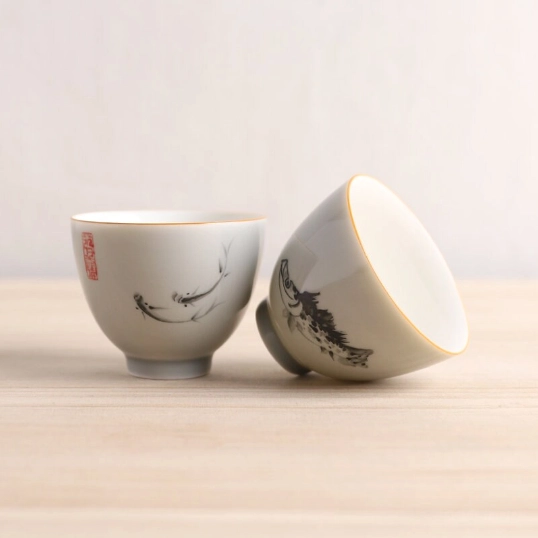 • Traditional Ink-Wash Art: Each cup features a hand-applied ink-wash style fish motif (available in one large fish or two small fish designs) paired with a traditional red seal stamp, bringing authentic Chinese art to your tea table