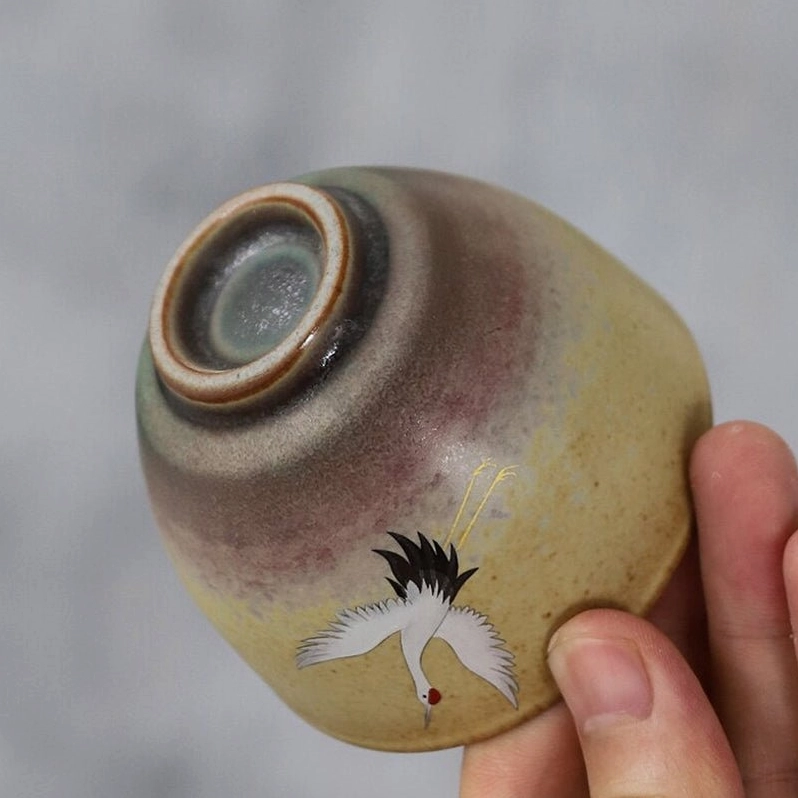Handcrafted 90ml Chinese ceramic gongfu tea cup with hand-painted flying crane, gradient kiln-change glaze, natural rustic texture, perfect for daily tea tasting and gifting.
