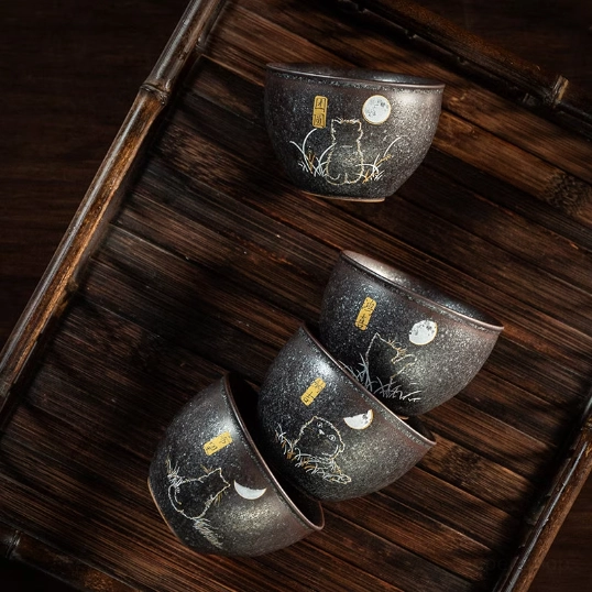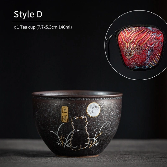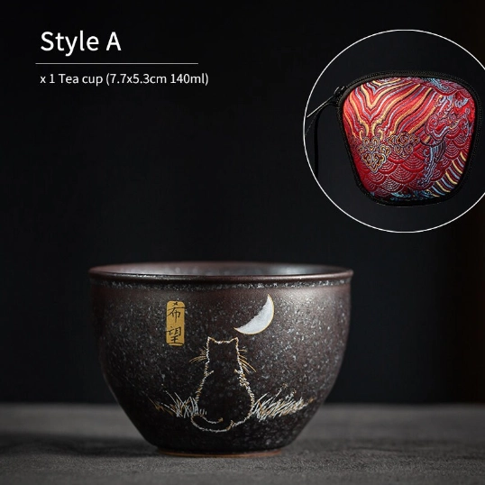 Adorable hand-decorated black ceramic gongfu tea cup with cute cat designs, 140ml perfect for daily sipping and gifting. Multiple unique styles to choose from.