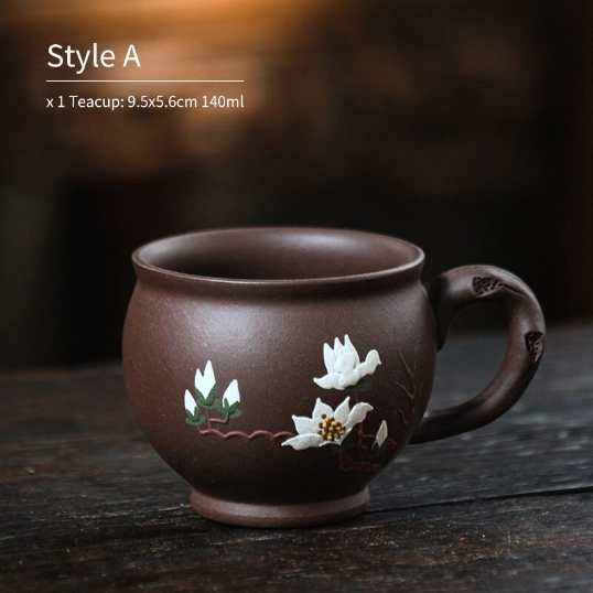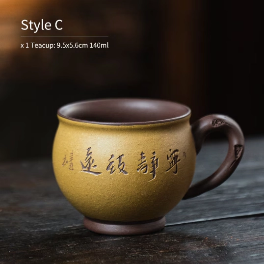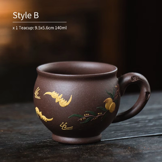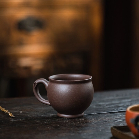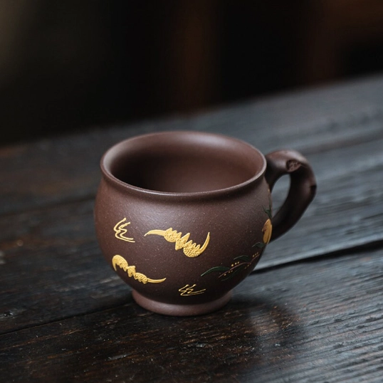 Authentic handmade Yixing Zisha clay品茗杯 (pinming cup) for Gongfu tea. Features unique decorative patterns, ergonomic handle, improves tea flavor, perfect for daily drinking, gifting & collecting.