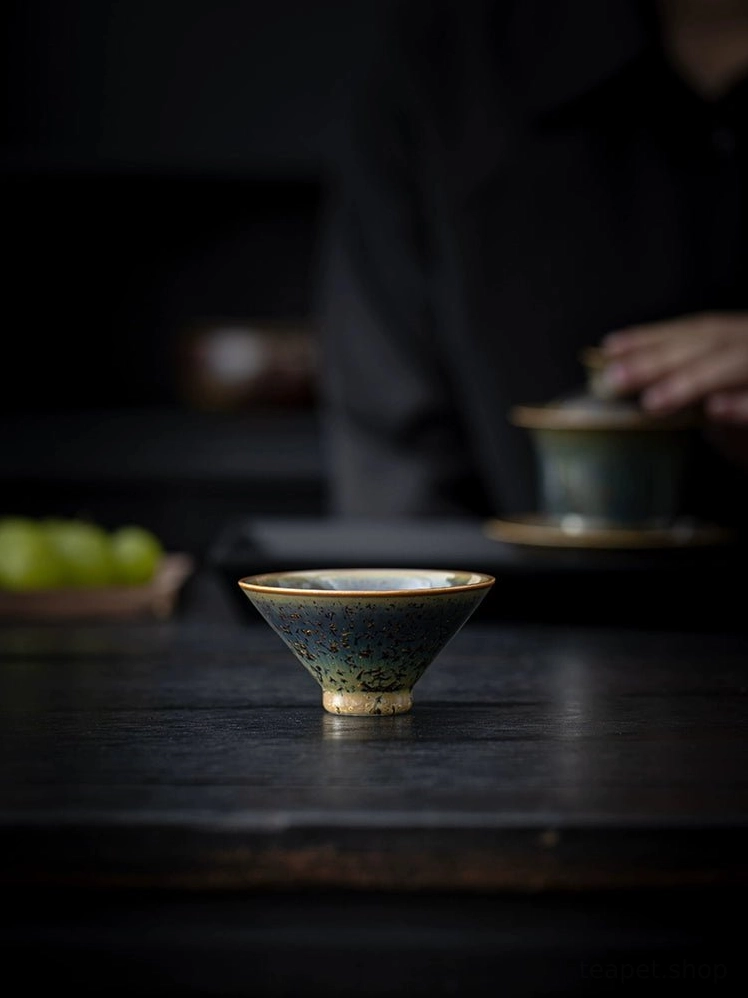Every Jian Zhan cup is one-of-a-kind thanks to the ancient kiln-changing firing process. This cup features a rich blue-green base glaze accented by natural golden speckles, creating a stunning layered visual effect that shimmers under light. The smooth glossy glaze is food-safe, easy to clean, and retains the natural aroma of your tea perfectly.