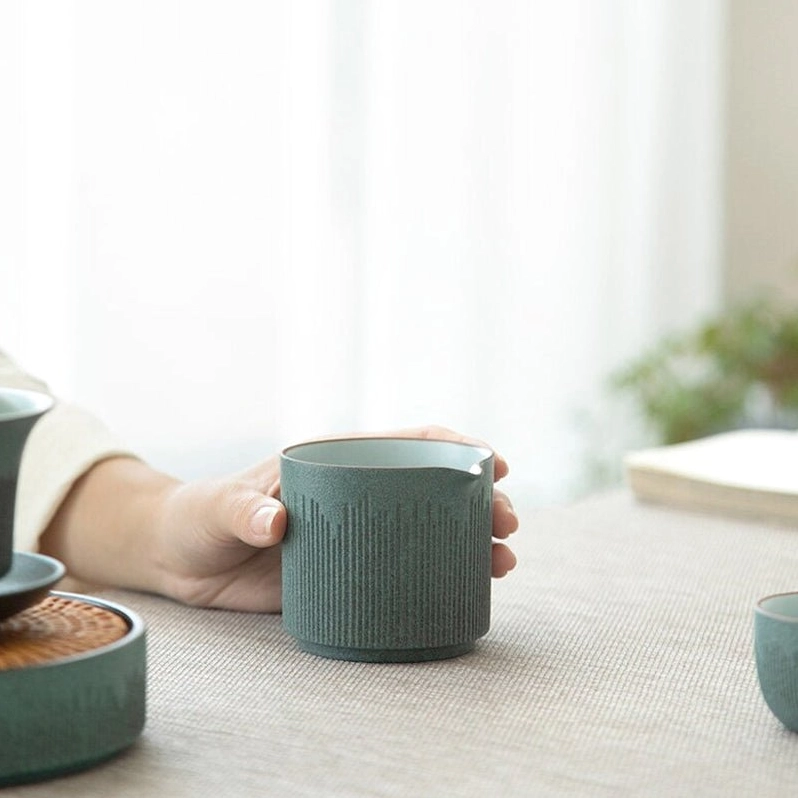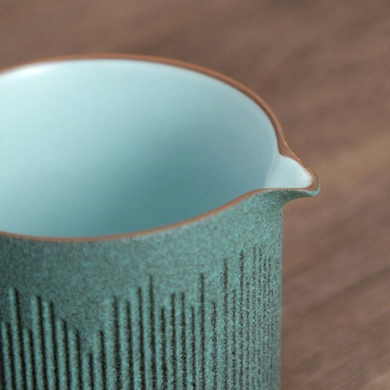 Handcrafted traditional Chinese ceramic Gong Dao Bei (tea pitcher) with textured vertical grooves, 150ml capacity for even tea serving and elevated tea ceremony experience.