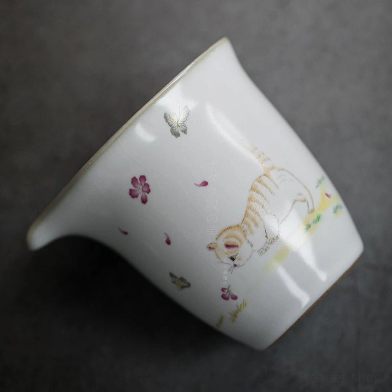 • Unique Cute Cat Pattern: Hand-finished playful design featuring an orange tabby cat, pink flowers, and a butterfly on a clean white background. This charming pattern adds a soft, cheerful touch to any tea setup, perfect for cat and nature lovers.