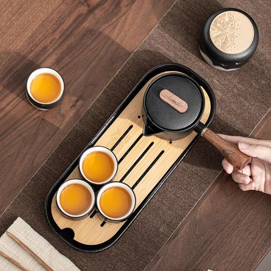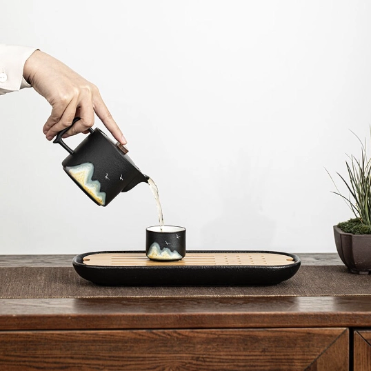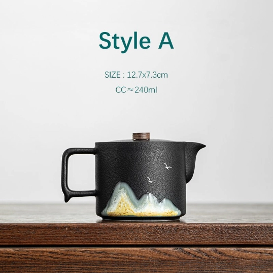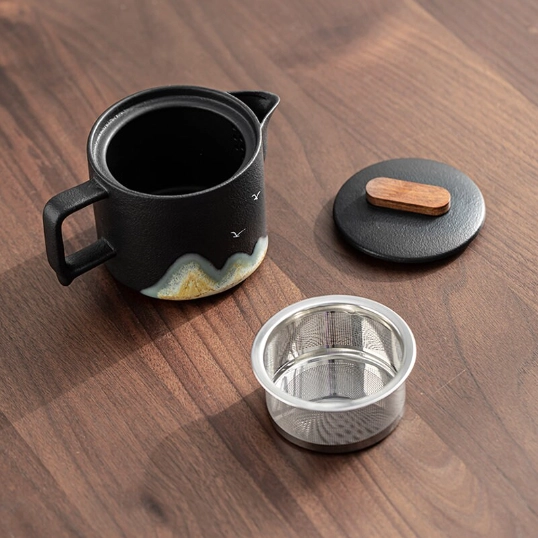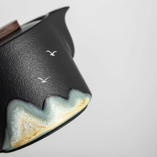 Rooted in thousands of years of Chinese tea tradition, this hand-crafted ceramic teapot blends traditional Chinese ink-wash art with modern practical design. The hand-painted landscape and flying bird motif on a matte black ceramic body evokes the quiet tranquility of traditional Chinese scholar gardens, turning every daily brew into a moment of peaceful mindfulness.