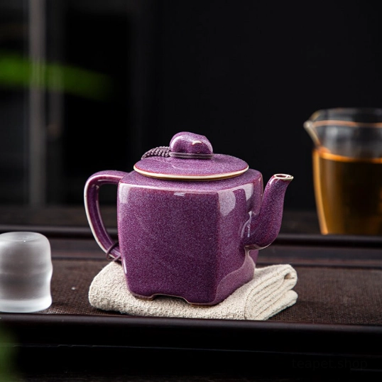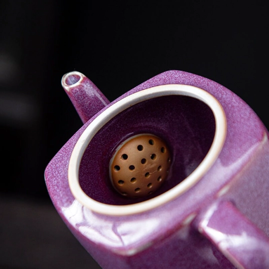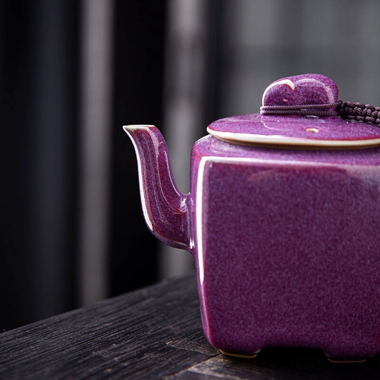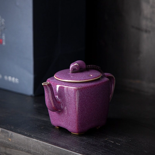 Unique kiln-changed purple glaze square ceramic teapot, handcrafted for Chinese tea ceremonies. Built-in strainer, perfect for 1-2 servings of loose leaf tea. Ideal gift for tea lovers.