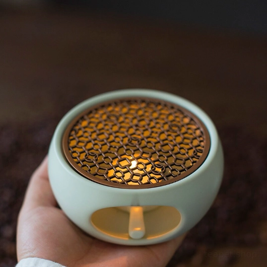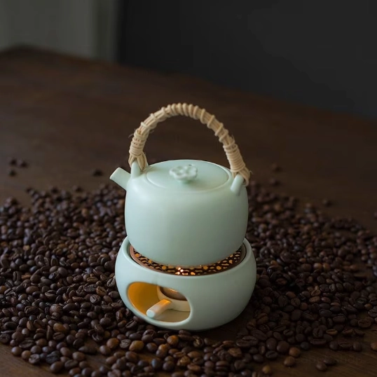 This set is crafted from high-purity Dehua kaolin clay, fired at ultra-high temperatures to create a durable, smooth glaze that will last for years of daily use. The teapot features a natural rattan wicker handle that stays cool to the touch, even with hot tea inside, and a delicate flower-shaped knob for easy lid handling. The candle warmer stove uses a ceramic base with a sturdy metal mesh top, with a side opening for quick candle replacement, letting you enjoy the gentle glow of a candle while keeping your tea perfectly warm.