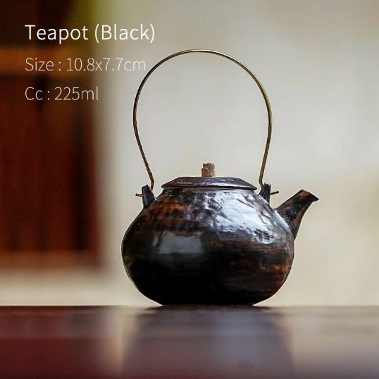 - Material: Food-safe ceramic (teapot & stove), brass-toned metal (handle), wood-effect ceramic (lid knob)