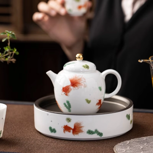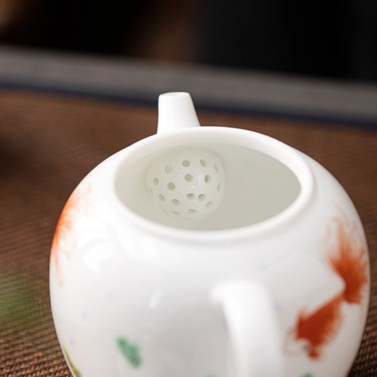 - Elegant Thoughtful Design: A clean white base highlights the vivid red goldfish and green watercress motif, accented with a shiny gold finial on the lid for a subtle touch of luxury. The ergonomic handle and curved spout deliver a smooth, drip-free pour every time.
