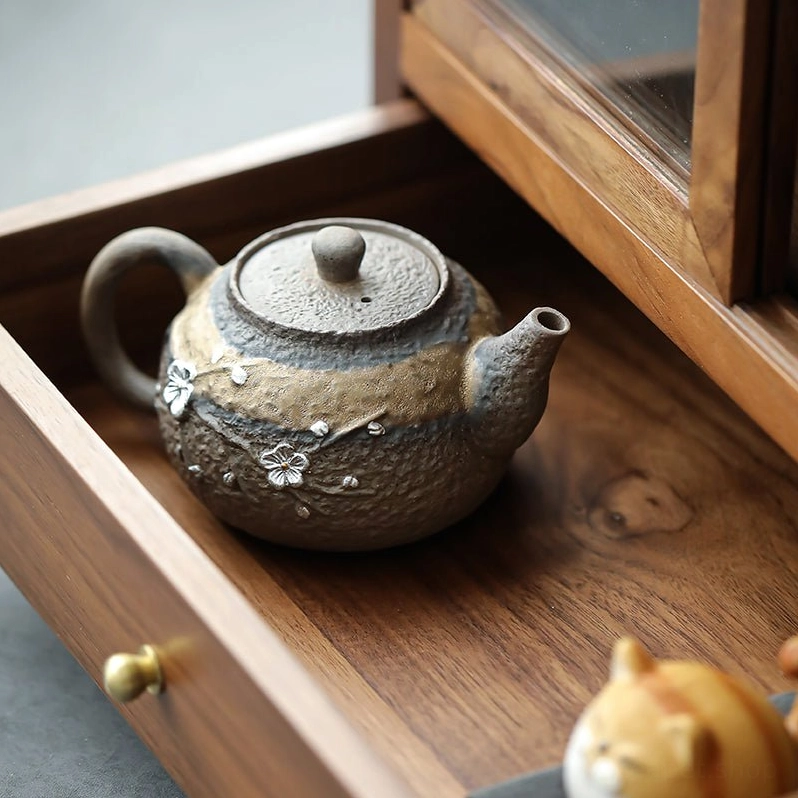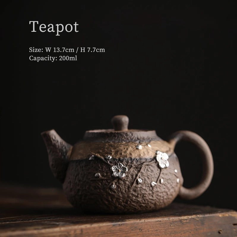 Crafted for tea lovers who value both tradition and beauty, this handmade coarse pottery teapot brings rustic elegance and functional design to your daily tea ritual. Adorned with an embossed silver plum blossom—an iconic symbol of resilience and nobility in Chinese culture—it’s more than just a brewing vessel: it’s a piece of traditional art for your tea collection.