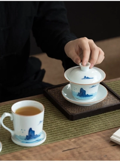 This hand-painted blue mountain gaiwan tea set is the ideal choice for: