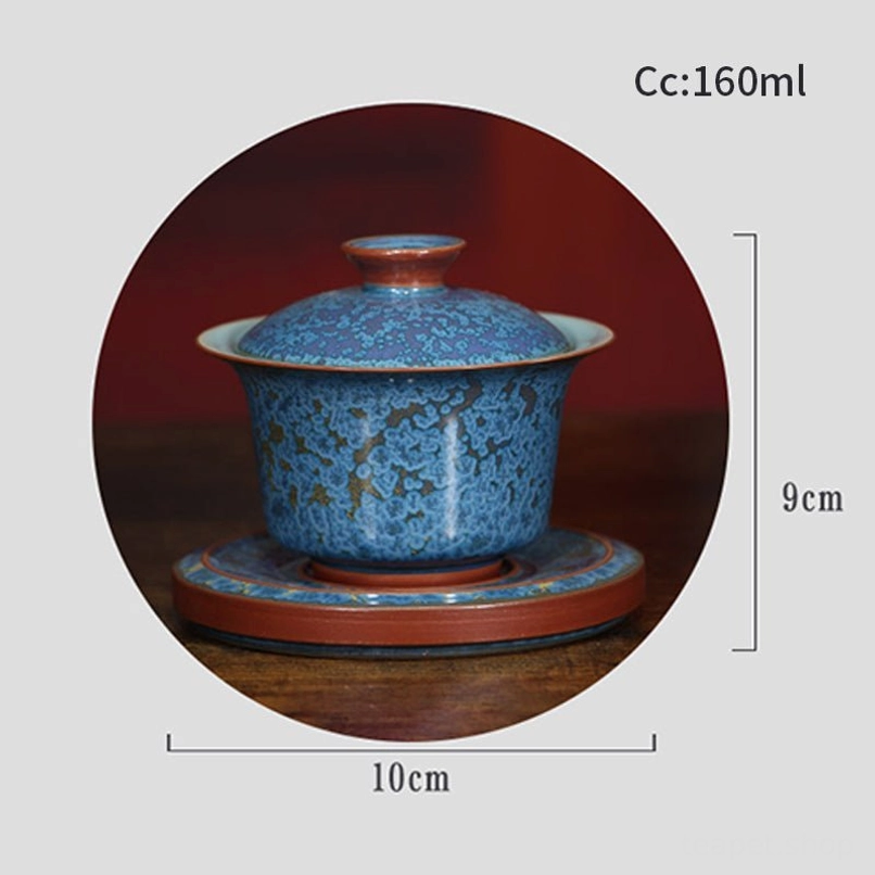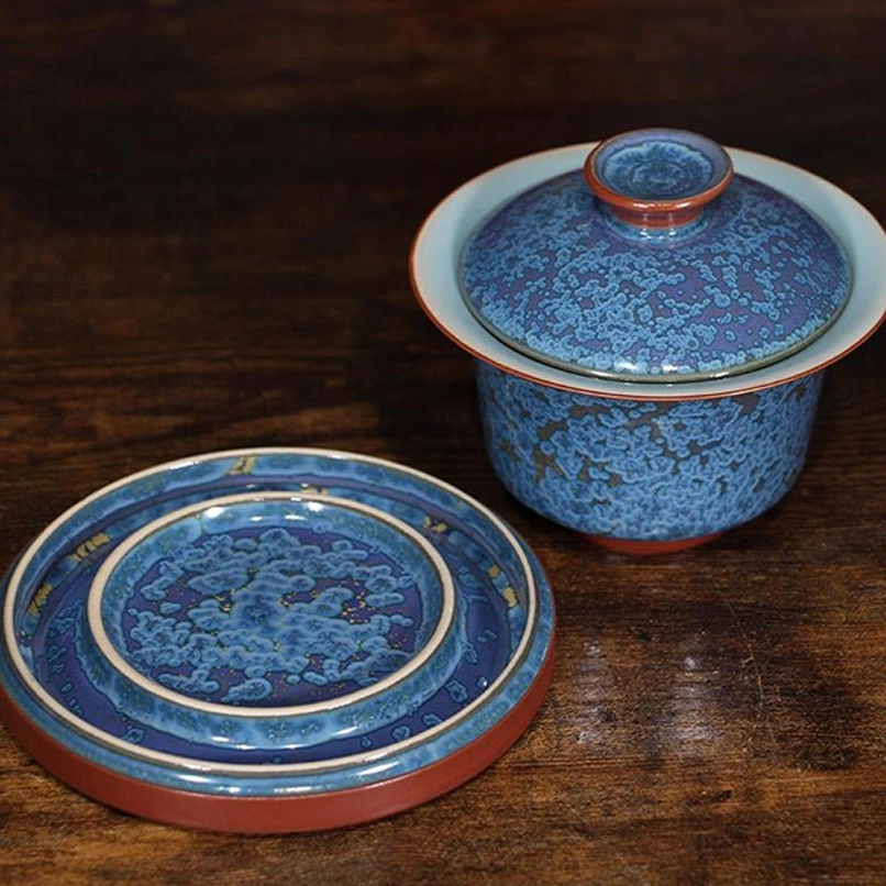 Authentic handmade Jun Kiln ceramic gaiwan tea set, 160ml perfect capacity for solo or small group gongfu tea brewing, with unique blue kiln-change glaze.
