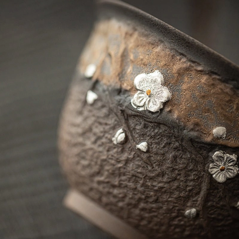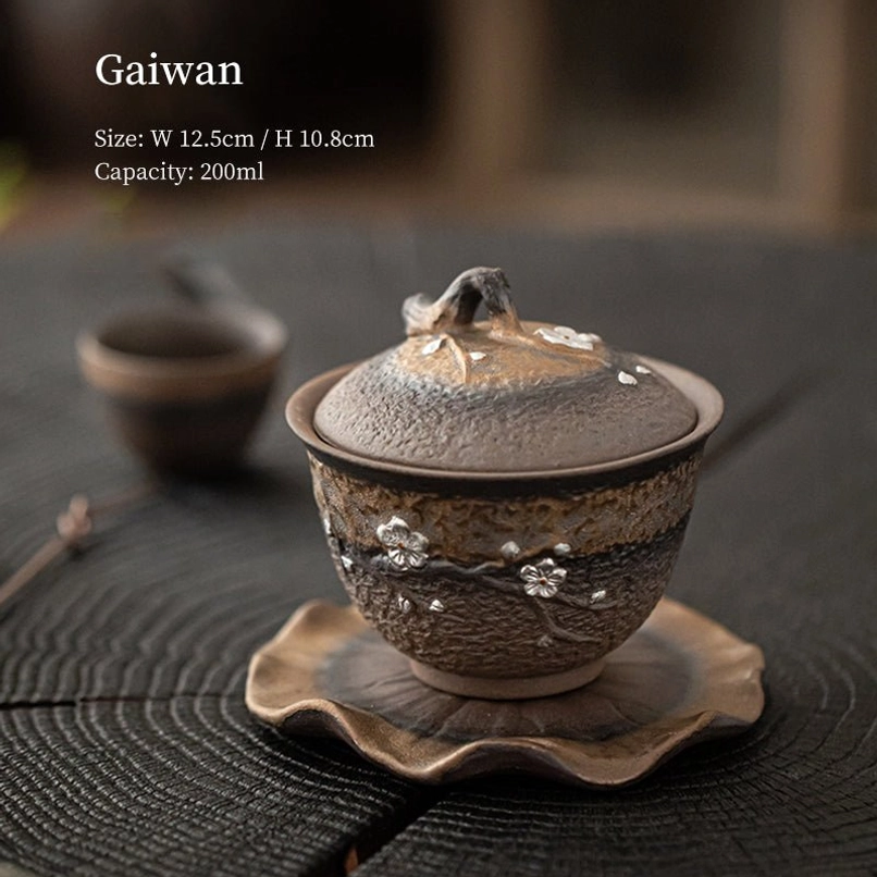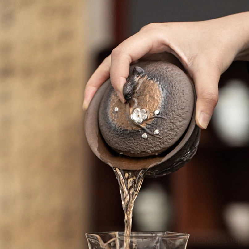 This stunning handcrafted gaiwan tea set blends traditional Chinese culture, master craftsmanship, and practical everyday use. Crafted from raw porous clay with a textured, earthy finish, it features an elegant raised relief plum blossom motif that brings natural Chinese aesthetics to your tea ritual.