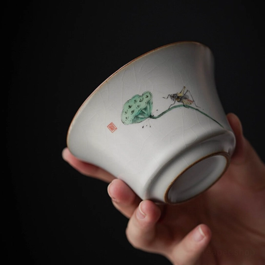 This vintage-inspired gaiwan features a delicate hand-painted lotus pod and cricket motif, a design rich with positive meaning in Chinese culture: