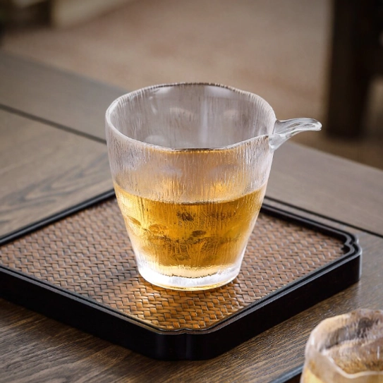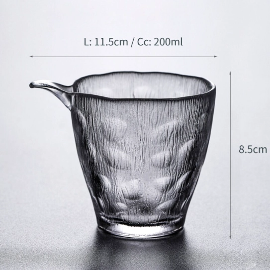 Handcrafted high borosilicate glass Gong Dao Bei (tea fairness pitcher) with unique textured design, 200ml capacity, perfect for Gong Fu Cha traditional tea preparation.