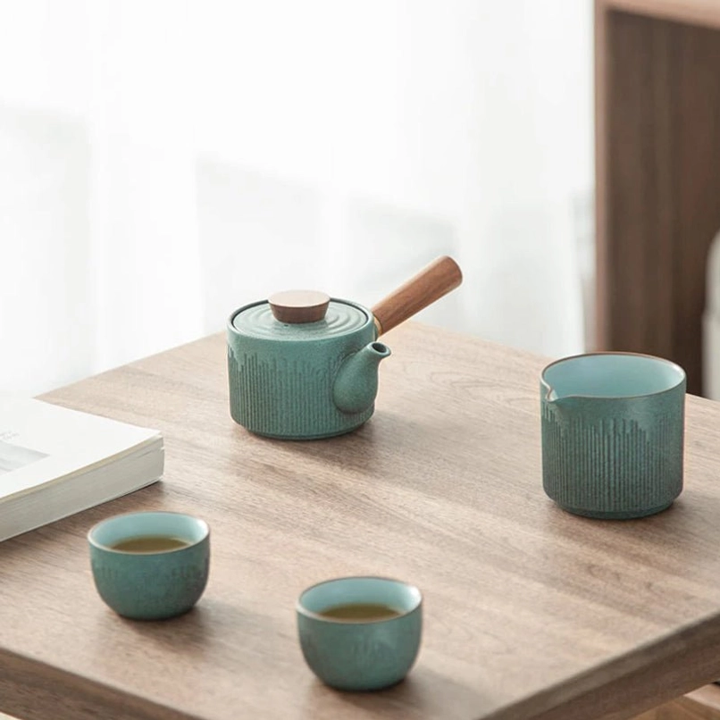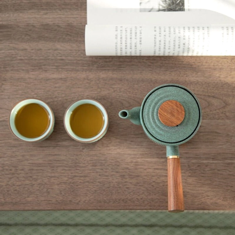 - Premium Mixed Materials: Durable ceramic body with textured vertical stripe finish retains heat evenly for better tea extraction, while natural wood handles provide excellent heat insulation to prevent burns. A polished gold metal accent ring adds subtle elegance to the design.