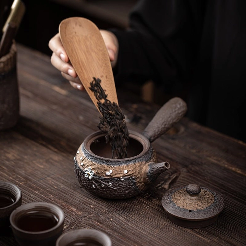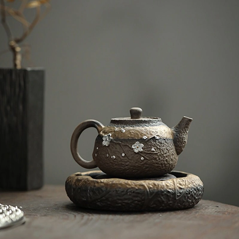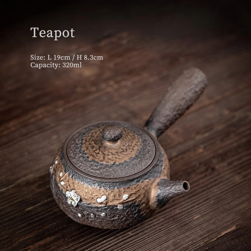 This handcrafted ceramic Kyusu teapot blends traditional East Asian tea ceremony aesthetics with modern practicality. Featuring a textured retro faux-iron finish and hand-inlaid silver plum blossom decoration, it is as beautiful to display as it is functional for daily brewing.
