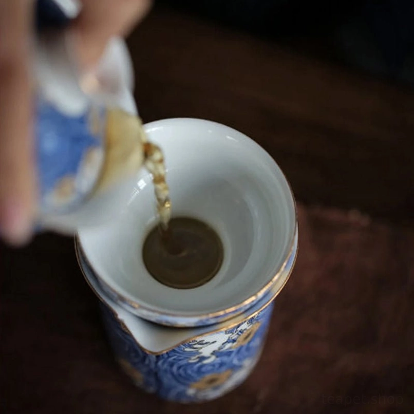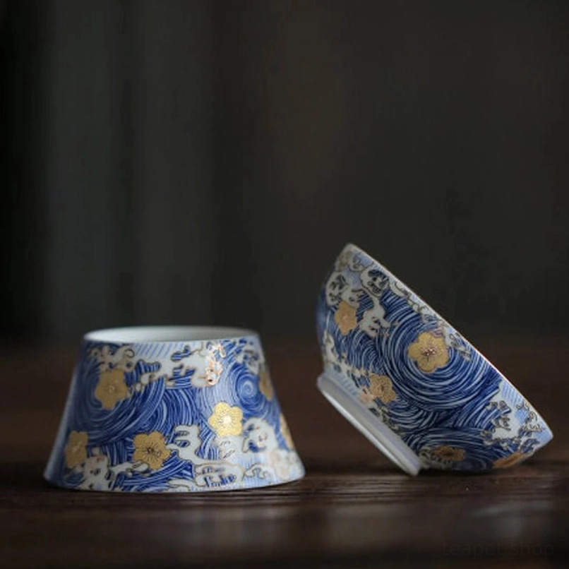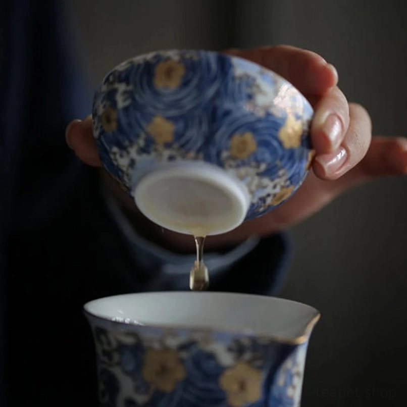 This strainer set features iconic traditional Chinese design: soft blue wave patterns paired with delicate gilded golden flowers on a creamy white ceramic base. In Chinese culture: