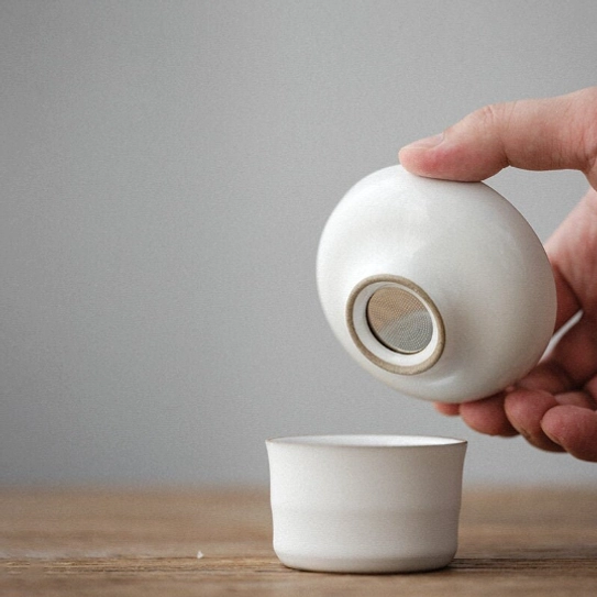 Complete minimalist Gongfu tea set with a fine mesh loose leaf tea strainer for smooth, clear loose leaf tea. Perfect for home, office and gifting.
