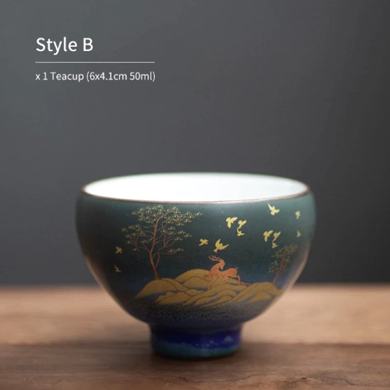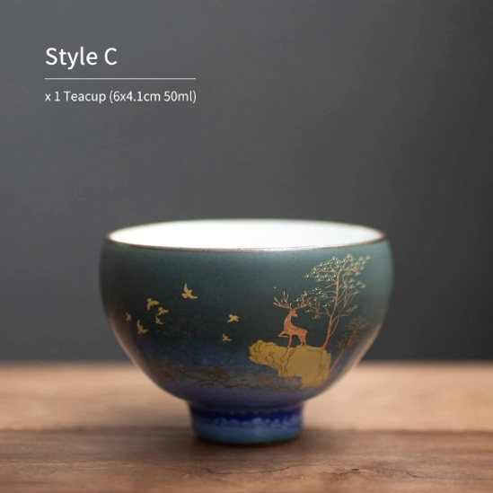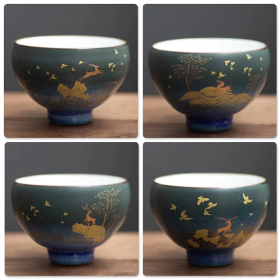 This 50ml small chawan tea bowl is a traditional Chinese gongfu tea tasting cup crafted from premium high-fired ceramic. Each piece features hand-applied overglaze enamel decoration with an elegant golden deer natural landscape motif, blending centuries-old Chinese tea culture with refined modern aesthetics. Perfect for both everyday slow tea sipping and formal traditional tea ceremonies, this unique chawan adds a touch of cultural elegance to any tea ritual.