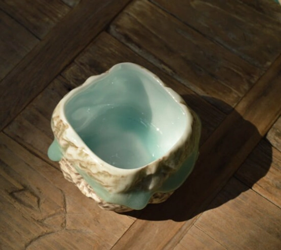 Unlike mass-produced teacups, this tea bowl is shaped to mimic the rough, organic texture of weathered natural river stone. It features an irregular softly squared rim and subtle undulating edges that feel gently worn by time, just like a stone found along a mountain stream. The organic gradient glaze blends earthy stone brown, soft moss green, and pale off-white, with a natural flowing glaze effect that gives each bowl unmatched character, bringing wild natural beauty to your tea table.