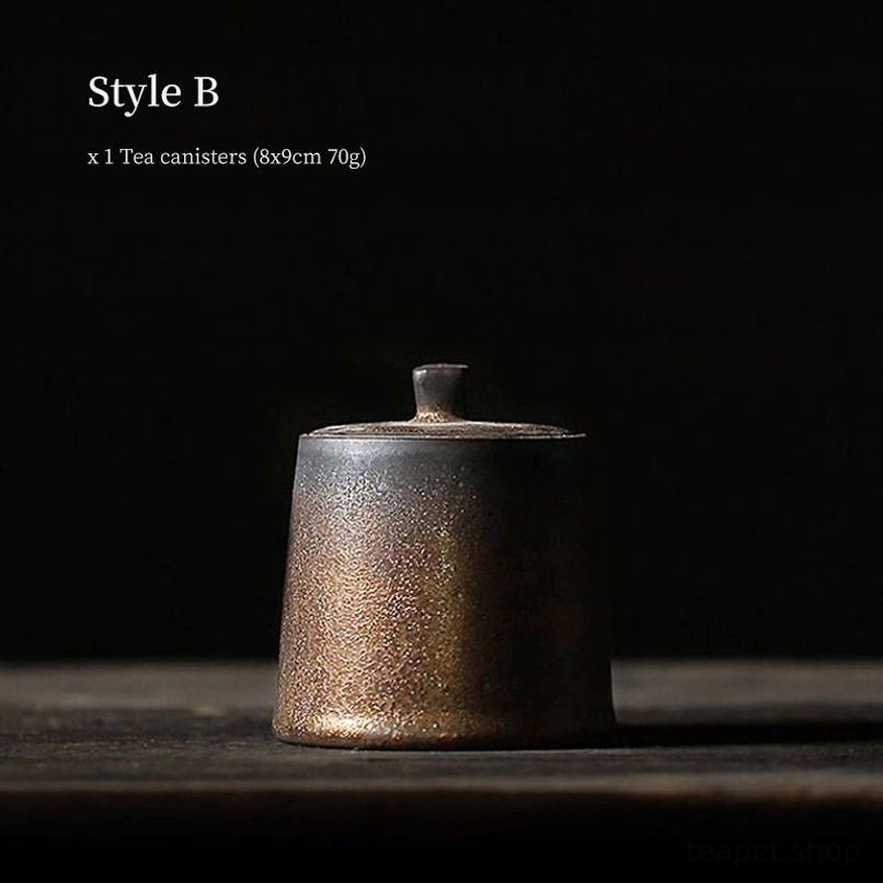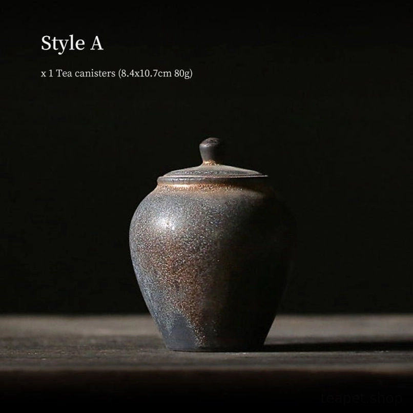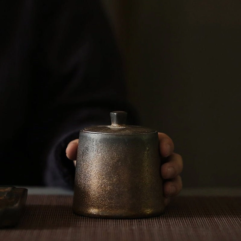 Handcrafted antique-style ceramic tea jar with rustic metal glaze. Airtight seal keeps tea fresh, perfect for home and travel. A unique addition to any Chinese tea collection.