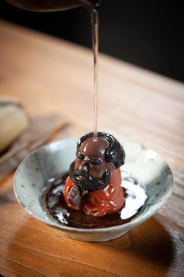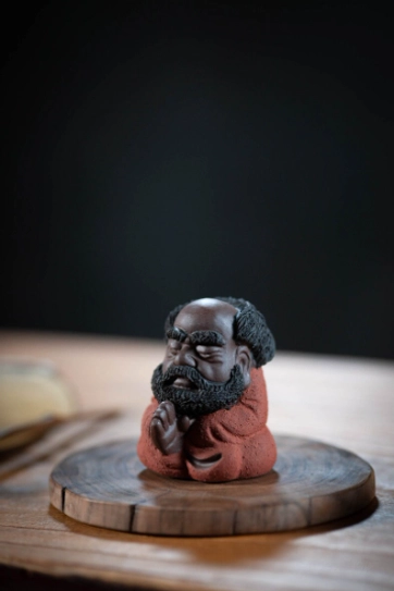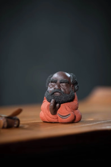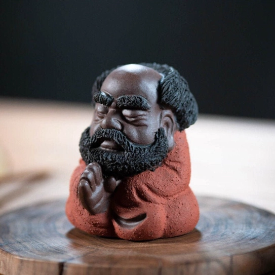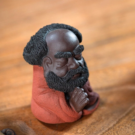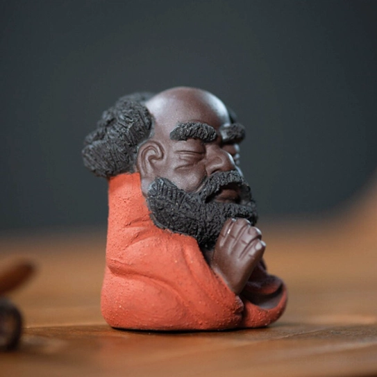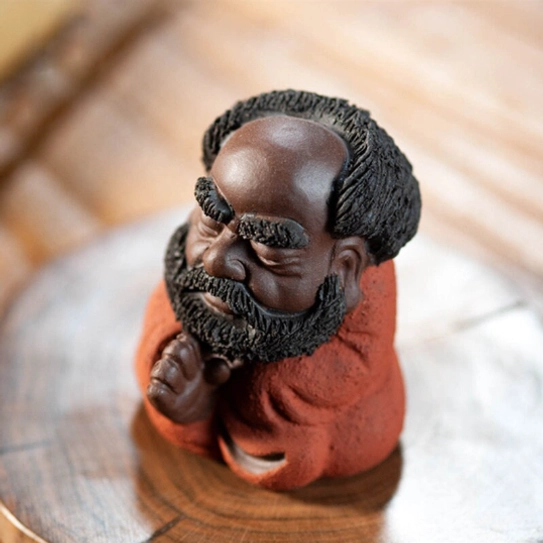 A beloved staple of traditional Chinese gongfu tea culture, a tea pet (chá chóng 茶宠) is a decorative, interactive table companion designed to be “nourished” with leftover tea during your daily brewing sessions. This charming piece features a whimsical, cute sculpt of Bodhidharma (Damo), the revered 6th-century monk who founded Chan (Zen) Buddhism. Our design softens his traditional serious image into a warm, approachable figure that still captures his iconic meditative energy, blending centuries of tea culture and spiritual heritage into one perfect small decor piece.