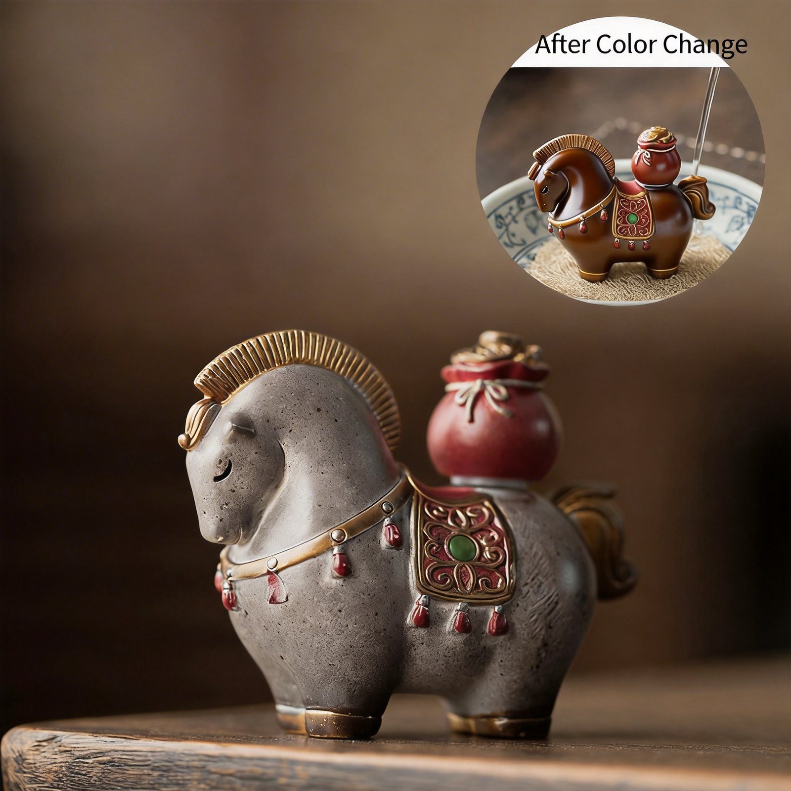 Each horse is handcrafted with care, using resin that mimics the feel of traditional Zisha clay. The texture? Think of a well-loved leather journal—smooth, with character that deepens over time. When you pour tea over it (yes, you water your tea pet!), it develops a rich patina, like a cast-iron skillet that’s been seasoned for years. This “tea seasoning” makes your pet uniquely yours, a testament to every brew shared.