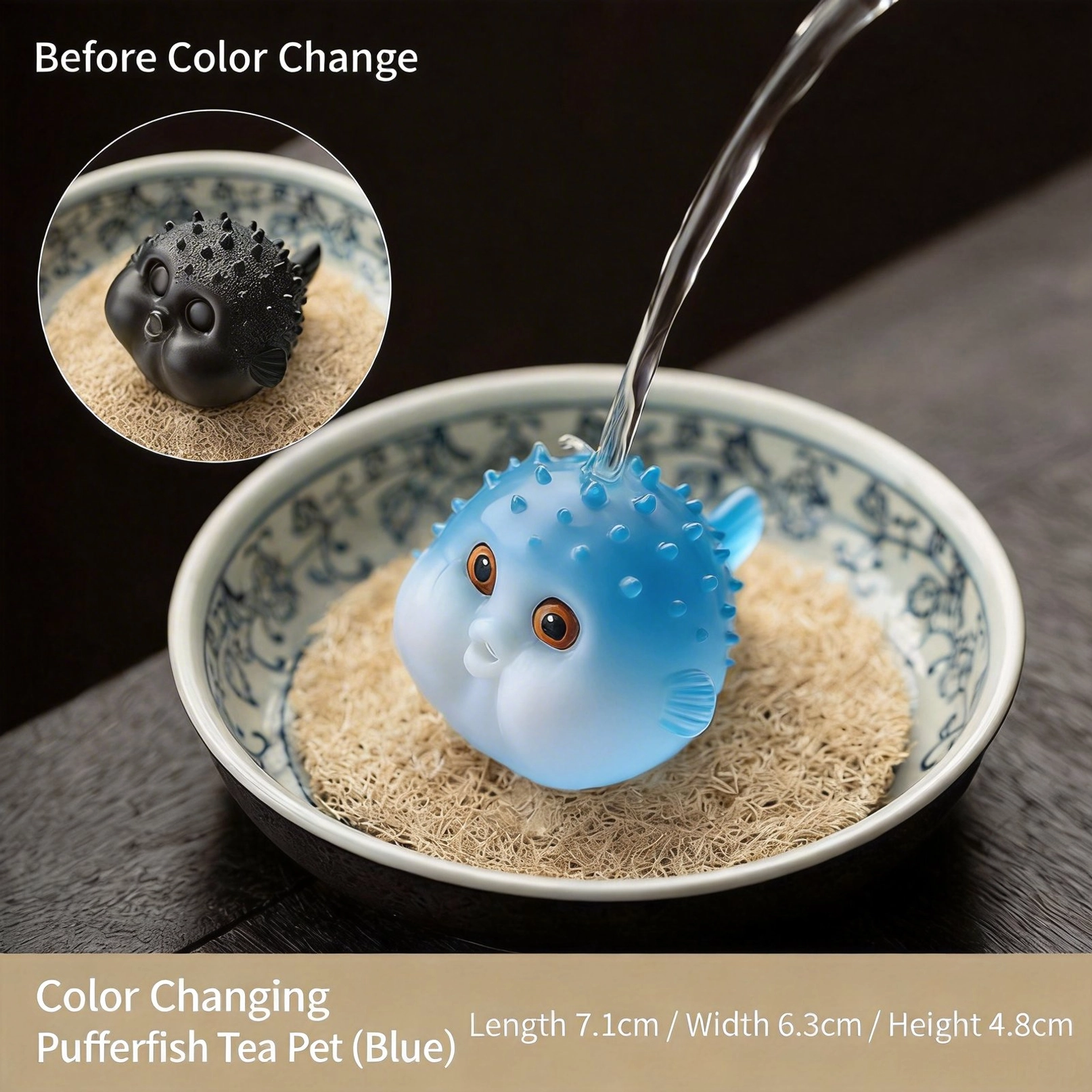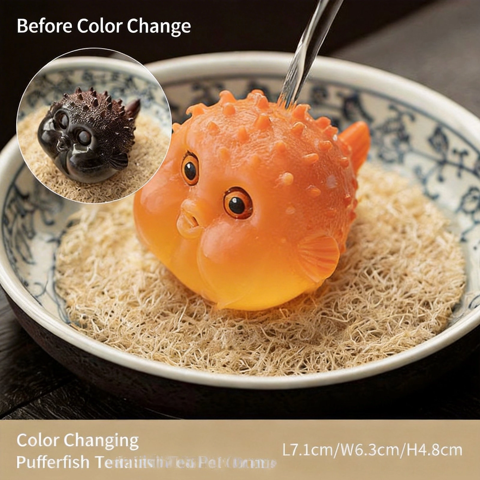 This adorable pufferfish tea pet puts a fun, modern twist on traditional tea culture. Crafted with a chubby, cartoon-inspired pufferfish shape complete with big friendly eyes and tiny textured spikes, it’s instantly endearing and adds a playful, whimsical touch to any tea setup. The magic comes from its special temperature-sensitive material: pour warm tea or hot water over it, and watch it transform from a muted dark base to bright, vivid blue or orange in seconds for a delightful interactive surprise every time you brew.