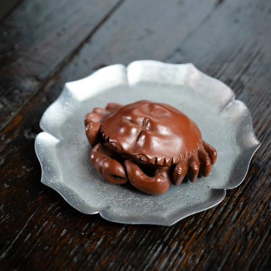 For centuries, tea pets (chá chǒng) have been cherished decorative and interactive companions for Chinese gongfu tea ceremonies. Placed on your tea tray, these small art pieces are nourished with leftover tea during brewing, developing a unique rich patina over time and becoming a personal, meaningful part of your daily tea ritual. This authentic Yixing zisha crab tea pet is a beloved classic for its gorgeous craftsmanship and powerful good fortune symbolism.