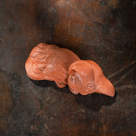 As a traditional tea pet, this piece is made from porous zisha-style clay. When you pour warm tea over it during your regular tea routine, the clay gradually absorbs tea oils and develops a rich, one-of-a-kind patina. Your tea pet literally “grows” with you over time, making it truly unique to your tea journey.