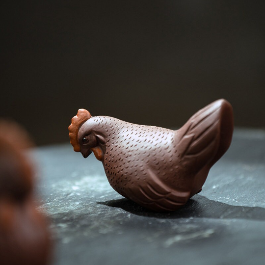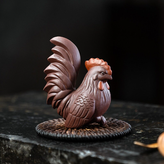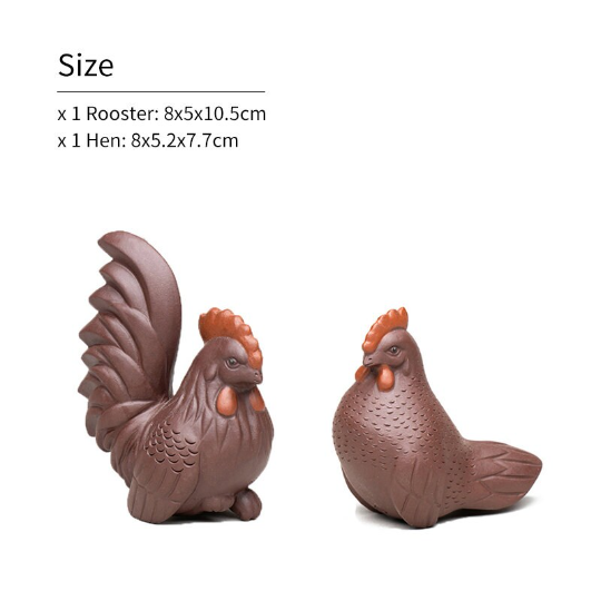 Crafted from high-quality natural purple clay (Zisha, a traditional Chinese ceramic material famous for its fine texture and excellent air permeability), this tea pet set is designed for long-term tea nourishment: as you pour leftover tea over it and wipe it gently during tea ceremonies, it will gradually develop a warm, glossy patina unique to your usage, growing in charm over time. Each piece is finely carved with realistic details: the rooster features layered, textured feathers and a vivid red comb, while the hen has a plump, gentle shape with delicate feather patterns, showcasing exquisite traditional craftsmanship.