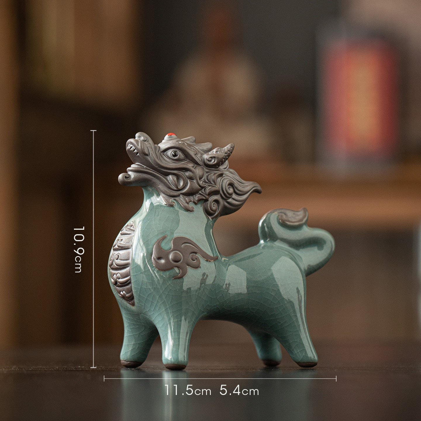 Each qilin tea pet measures approximately 4.3 inches (10.9 cm) in height, 4.5 inches (11.5 cm) in length, and 2.1 inches (5.4 cm) in depth — perfectly sized to sit on your tea tray, desk, or shelf without taking up excess space.