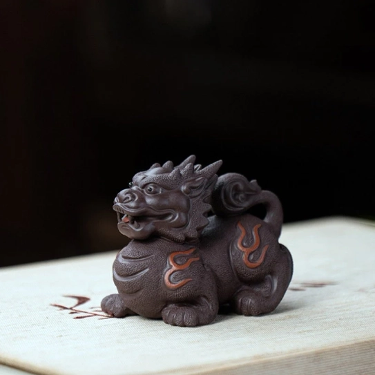 In Chinese tea culture, a tea pet is a beloved decorative and interactive accessory placed on your tea tray, nurtured with leftover tea over time to develop a one-of-a-kind glossy patina. This handcarved Qilin tea pet blends ancient mythical symbolism with premium Yixing purple clay (zisha) craftsmanship, bringing centuries of Chinese cultural tradition to your daily tea practice.