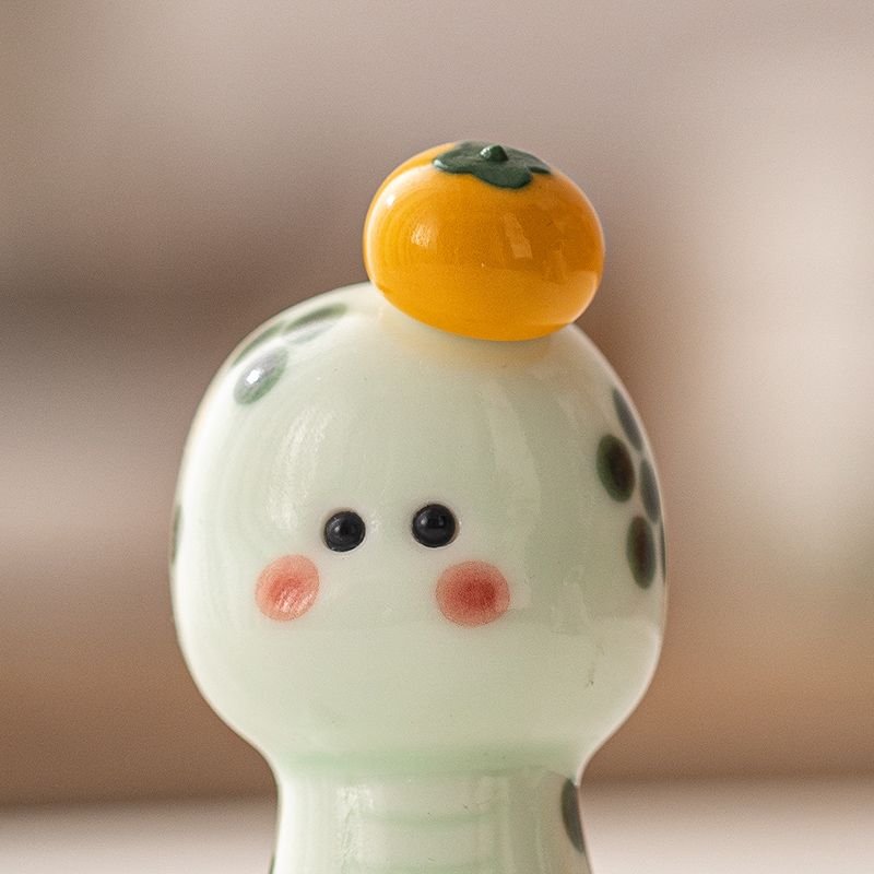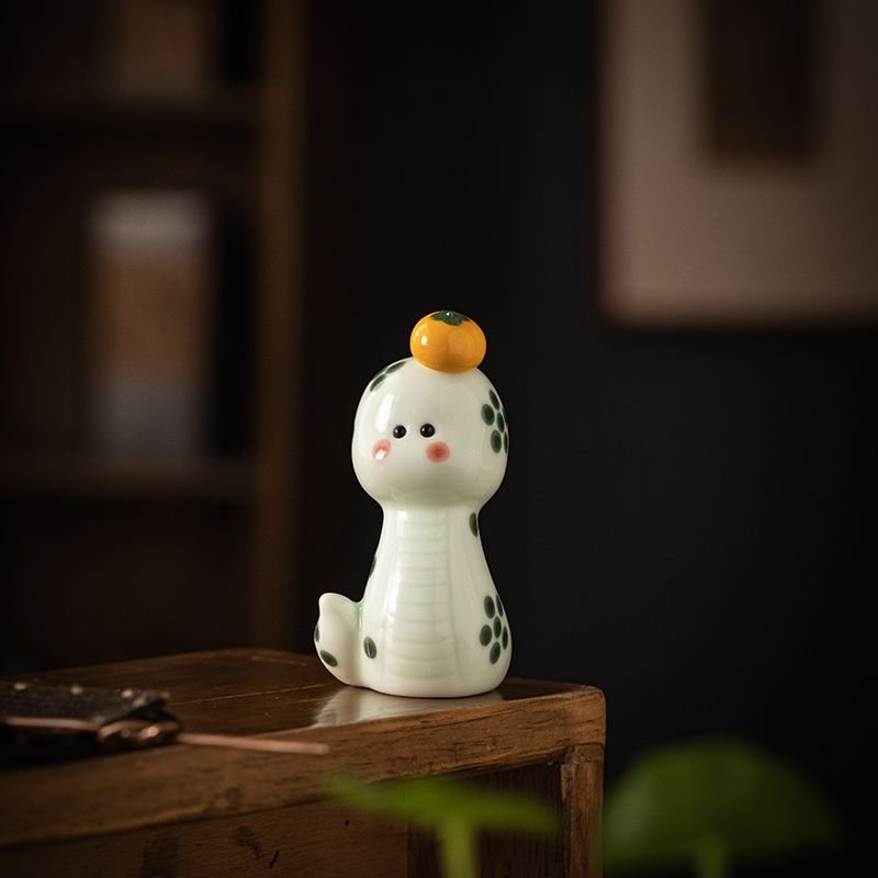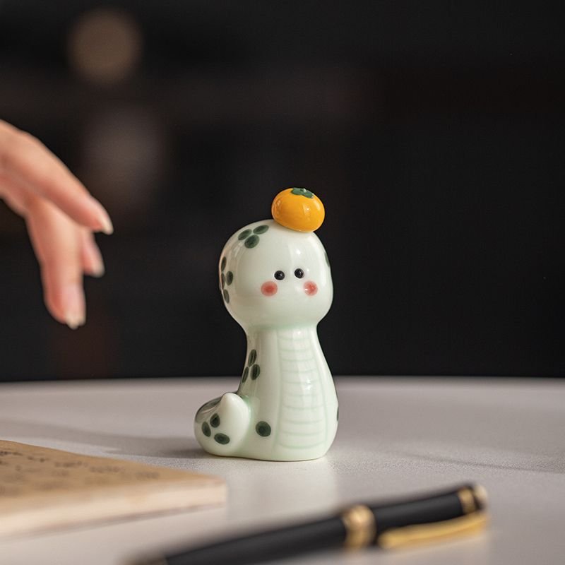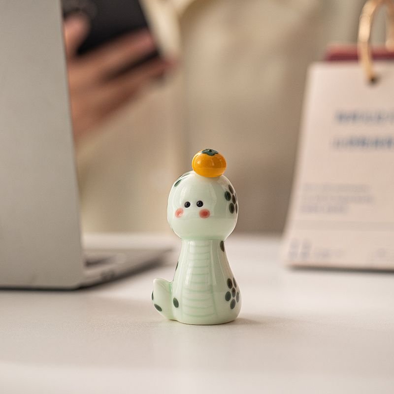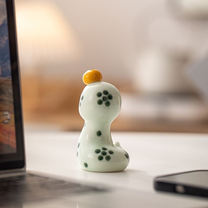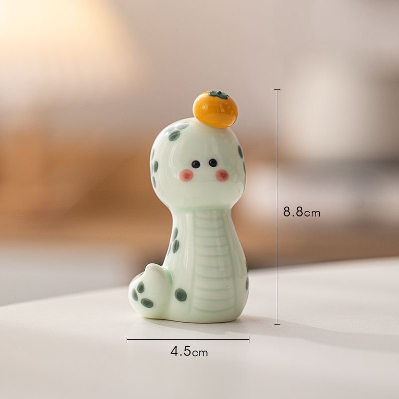 This charming snake figurine is a traditional Chinese tea pet, designed to bring joy and good luck to your tea ceremony space. Made from high-quality, durable ceramic with a smooth glaze finish, it features a soft light greenish-white base with delicate green spots, rosy pink cheeks, and a small, hand-painted persimmon on its head.