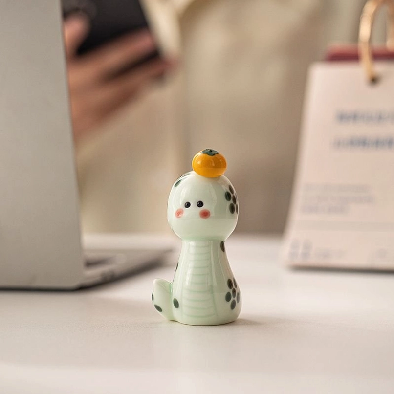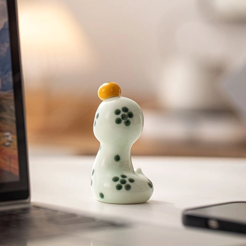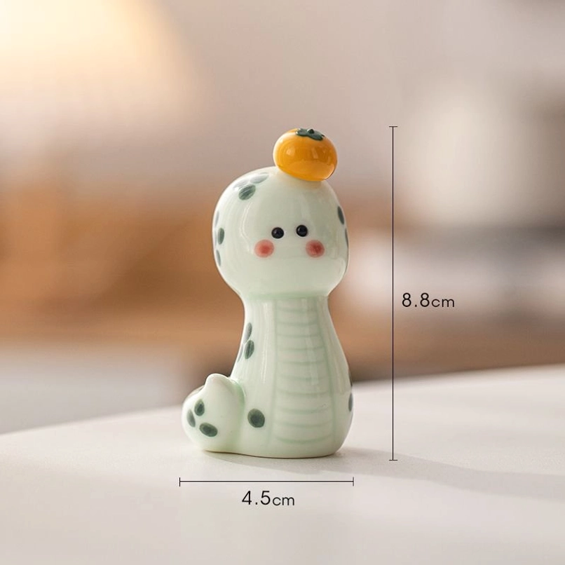 This charming cute ceramic snake tea pet is a whimsical, meaningful addition to any traditional or modern tea lovers collection. Handcrafted with attention to detail, this 2025 Year of the Snake zodiac figurine features a soft pale green-white glaze, playful spotted details, rosy pink cheeks, and a hand-painted lucky persimmon accent on its head, bringing warmth and good fortune to your tea space.