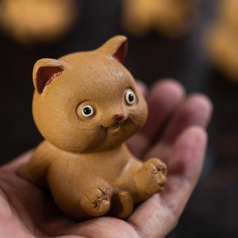 Caring for your kitten tea pet is simple: as you brew tea, pour leftover warm tea over the surface to let the clay absorb the tea’s natural oils. Wipe gently with a soft cloth – never use soap, as soap will block the clay’s pores and ruin the patina development. Over months and years, your tea pet will slowly darken and develop a soft, beautiful glow that reflects your unique tea ritual.