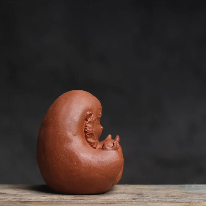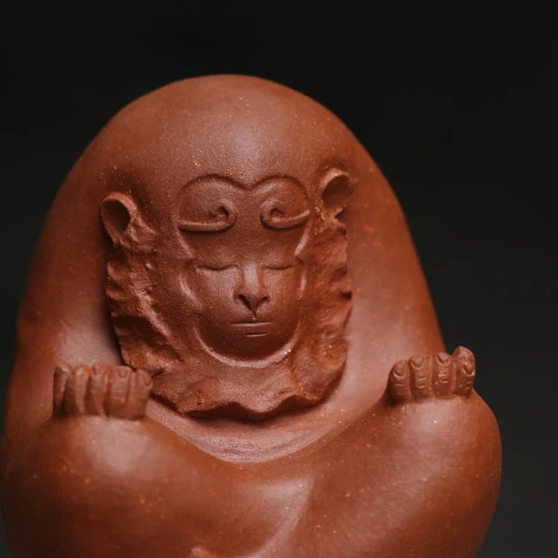 The Monkey King, also known as Sun Wukong, is one of the most beloved figures in Chinese folklore, representing courage, wisdom, protection, and good fortune. This interpretation features a serene, meditating Monkey King wearing his iconic golden circlet, holding a removable golden staff that doubles as an incense stick stand — a thoughtful blend of mythological charm and Zen aesthetics. For tea lovers, nurturing a tea pet over time by pouring leftover tea over it will gradually create a unique, lustrous patina (known as bao jiang in Chinese), making your pet truly one-of-a-kind as it ages with your tea journey.