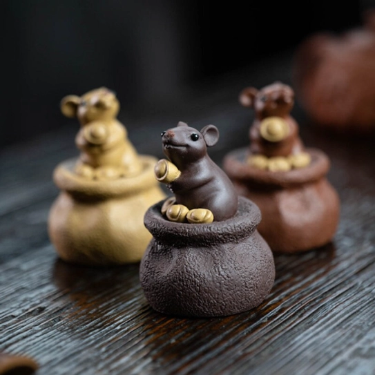This charming hand-carved tea pet draws inspiration from centuries of Chinese zodiac and fortune folklore. The rat (or mouse) is the first animal of the Chinese zodiac, revered as an auspicious symbol of abundance, smart business sense, and steady prosperity. When paired with a traditional gold ingot (Yuanbao, ancient Chinese currency) and a cloth money bag, this design carries the classic blessing of zhao cai jin bao (招财进宝) — welcoming wealth and good fortune into your home or business.